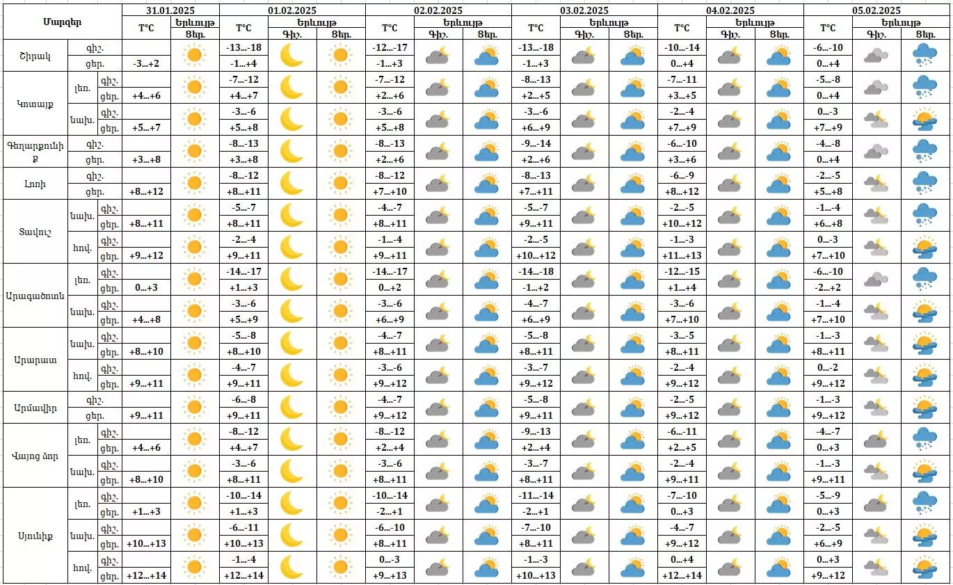 Երևան քաղաքում ևս փետրվարի 1-5-ին սպասվում է առանց տեղումների եղանակ: Մայրաքաղաքում փետրվարի 1-ի ցերեկը կգրանցվի +8…+10 աստիճան, իսկ երեկոյան ժամերին կլինի 0…+2 աստիճան։