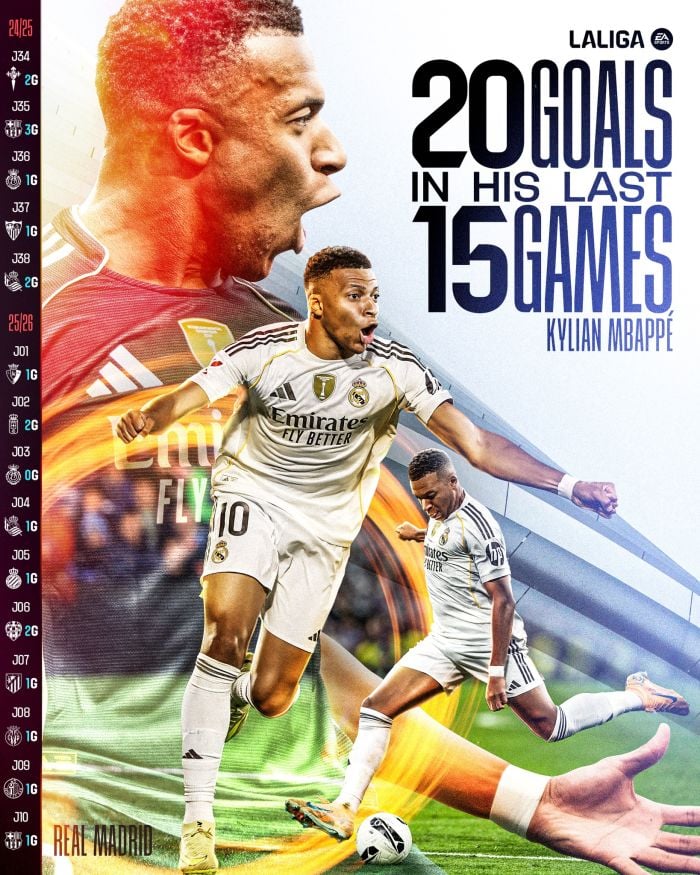 Իսպանիայի փոխչեմպիոն Մադրիդի «Ռեալի» ֆրանսիացի հարձակվող Կիլիան Մբապեն երկրորդ անգամ անընդմեջ ճանաչվեց Լա Լիգայի ամսվա լավագույն խաղացող, հաղորդում է մրցաշարի կայքը։